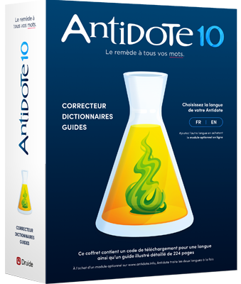 Description du produit. Aucune Antidote est un assistant de choix pour bien écrire en français ou en anglais. Que vous rédigiez une lettre ou un courriel, cliquez sur un bouton et voyez s’ouvrir un des ouvrages de référence parmi les plus riches et les plus utiles jamais.